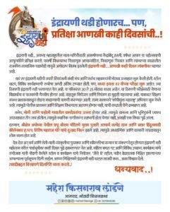 देव-देश अन् धर्म आणि शेती-माती-संस्कृतीचा पुरस्कार आणि स्त्रीशक्तीचा सन्मान या संकल्पनेतून होणारा इंद्रायणी थडी महोत्सव काही दिवस पुढे ढकलण्यात येत आहे. महिला बचत गट आणि विविध उपक्रम, कार्यक्रम यांचे संयोजक यांनी नोंदणी केलेले स्टॉल व कार्यक्रम याचे नियोजन ‘जैसे थे’ राहील. नवीन वेळाप्रत्रक निश्चित झाल्यानंतर सर्वानाच याबाबत पूर्वसूचना दिली जाईल. आपण सर्वजण मिळून निश्चितपणे इंद्रायणी थडी अगदी थाटात साजरी करण्यात येणार आहे.