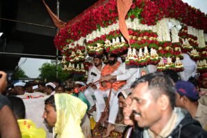 आषाढी वारीनिमित्त संत तुकाराम महाराजांचा पालखी सोहळा पिंपरी-चिंचवड शहरात भक्तिभावाने आणि जल्लोषात दाखल झाला. शहराच्या भक्ती-शक्ती चौकात वारीचे भव्य स्वागत करण्यात आले. या पार्श्वभूमीवर भाजपा आमदार महेश लांडगे यांनी पालखी सोहळ्याचे सारथ्य करत श्रद्धेचा अनोखा संदेश दिला. शहरात पालखीचे आगमन होताच, टाळ-मृदुंगांच्या गजरात, हरिनामाच्या जयघोषात वारीच्या आगमनाने वातावरण भारावून गेले. वरुणराजानेही वारीच्या स्वागतासाठी हजेरी लावली, आणि त्या सरींमध्ये हजारो वारकऱ्यांचा मेळा एकत्रितपणे आकुर्डीतील मुक्कामाच्या दिशेने मार्गस्थ झाला.