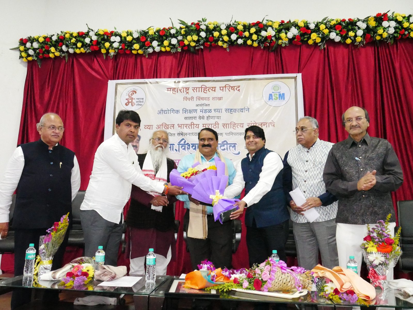 येथील औद्योगिक शिक्षण मंडळाच्या सभागृहात 99 व्या अखिल भारतीय मराठी साहित्य संमेलनाचे नियोजित अध्यक्ष, ज्येष्ठ साहित्यिक विश्वास पाटील यांचा पद्मश्री गिरीश प्रभुणे यांच्या हस्ते सत्कार करण्यात आला.
