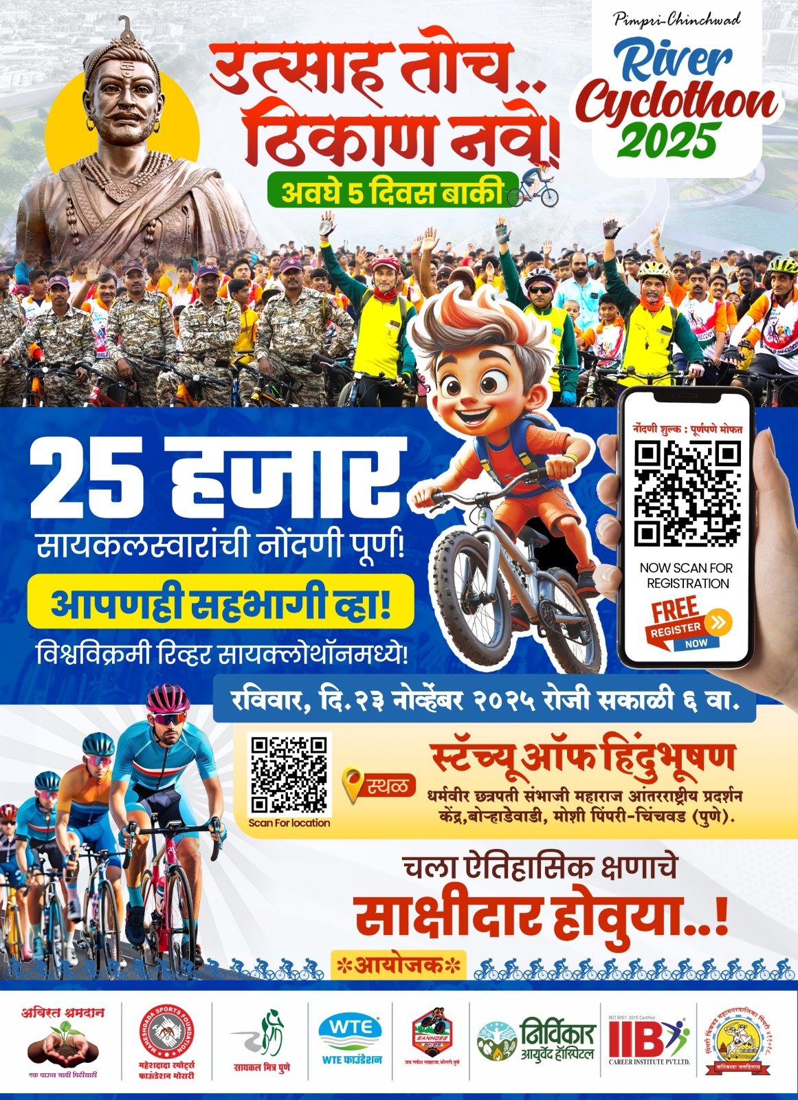 इंद्रायणी नदी स्वच्छतेचा संदेश देणाऱ्या ‘रिव्हर सायक्लोथॉन 2025’ या भव्य उपक्रमाला पुणे- पिंपरी-चिंचवडकरांनी उत्स्फूर्त प्रतिसाद दिला आहे. डुडूळगाव, मोशी येथील ‘स्टॅच्यू ऑफ हिंदुभूषण’ आंतरराष्ट्रीय औद्योगिक प्रदर्शन केंद्र येथे दि. २३ नोव्हेंबर रोजी सकाळी ६ वाजता होणाऱ्या या सायक्लोथॉनसाठी आतापर्यंत २५ हजाराहून अधिक सायकलपटूंची नोंदणी पूर्ण झाली असून, अवघे ५ दिवस शिल्लक असताना आणखी मोठ्या प्रमाणावर नोंदणी वाढण्याची शक्यता आहे, अशी माहिती समन्वयक डॉ. निलेश लोंढे यांनी दिली.